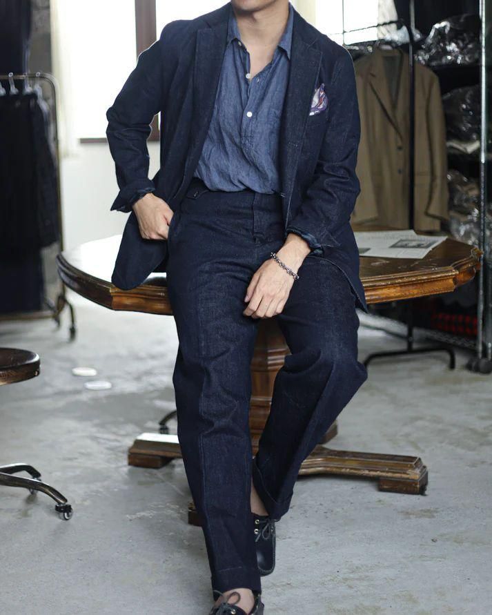 デニム特有の素材感をスーツとして成立させるために、長年信頼する工場にて仕立てを依頼しました。