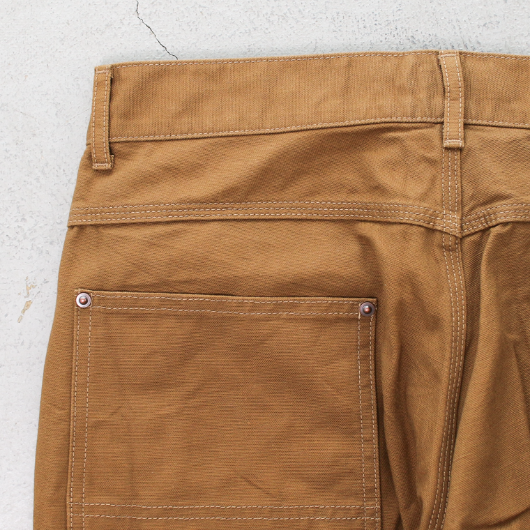 3本ステッチの巻縫いや、適材適所にリベットバーで補強した仕様、後ろポケットの底には補強用のスレキを貼る二重仕様で、ワークパンツらしい頑丈な作りに。