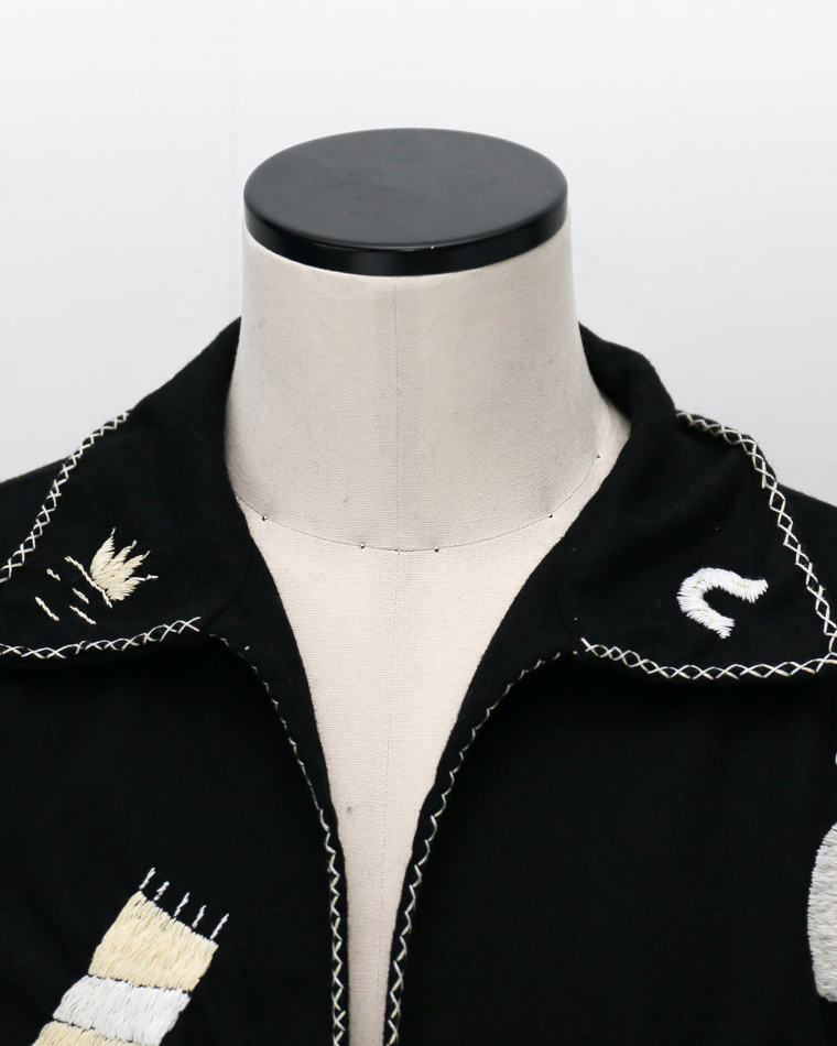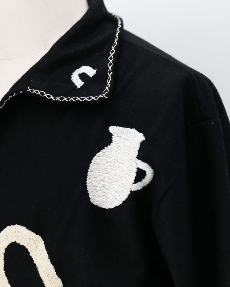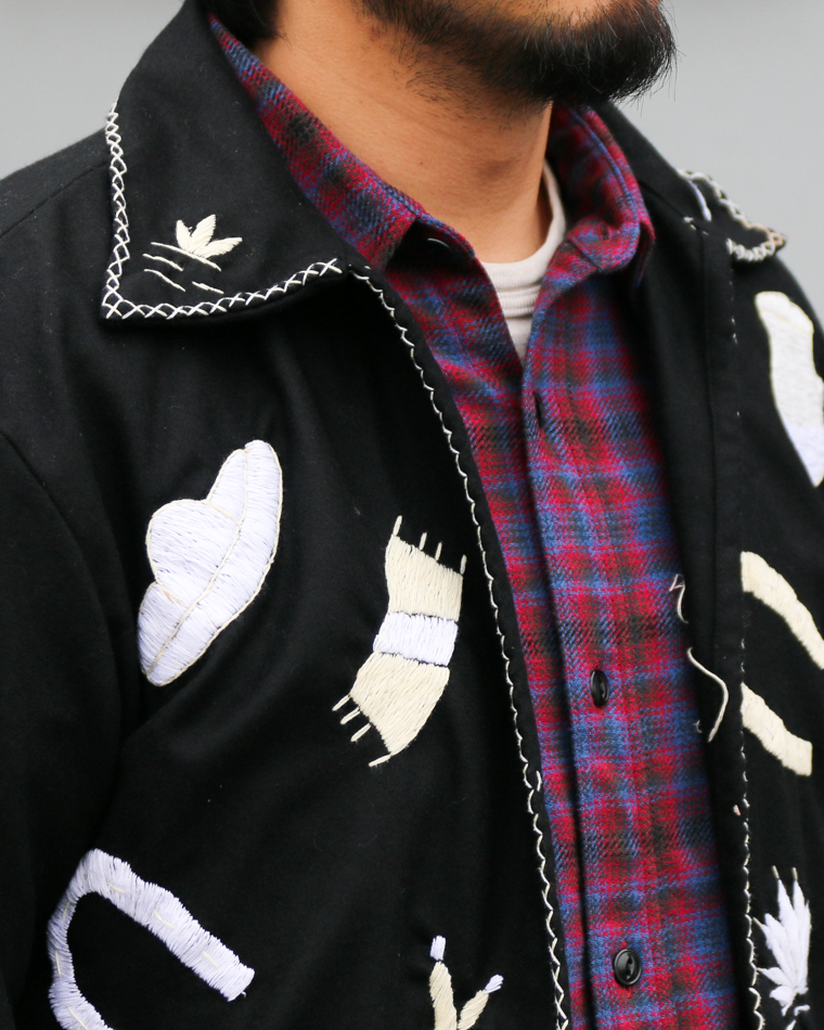 また、襟や前立て、袖口、ポケット口にまで刺繍が施されております。