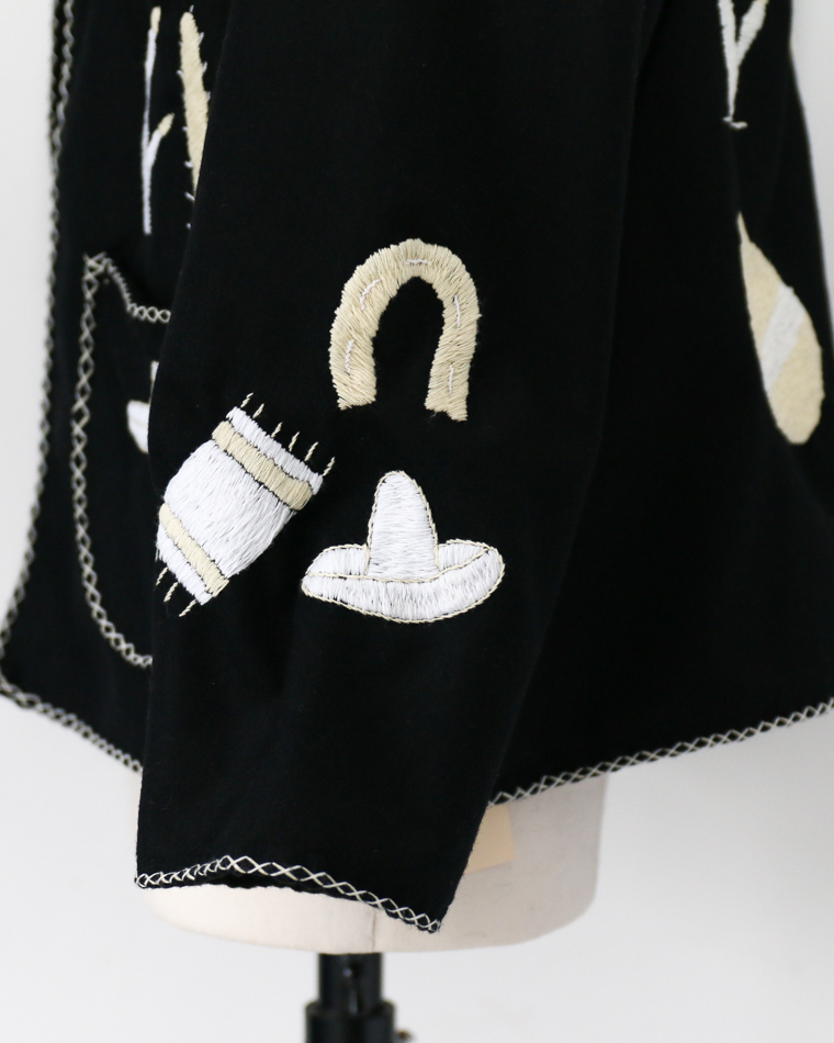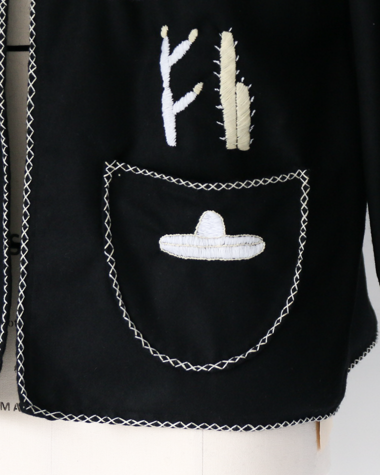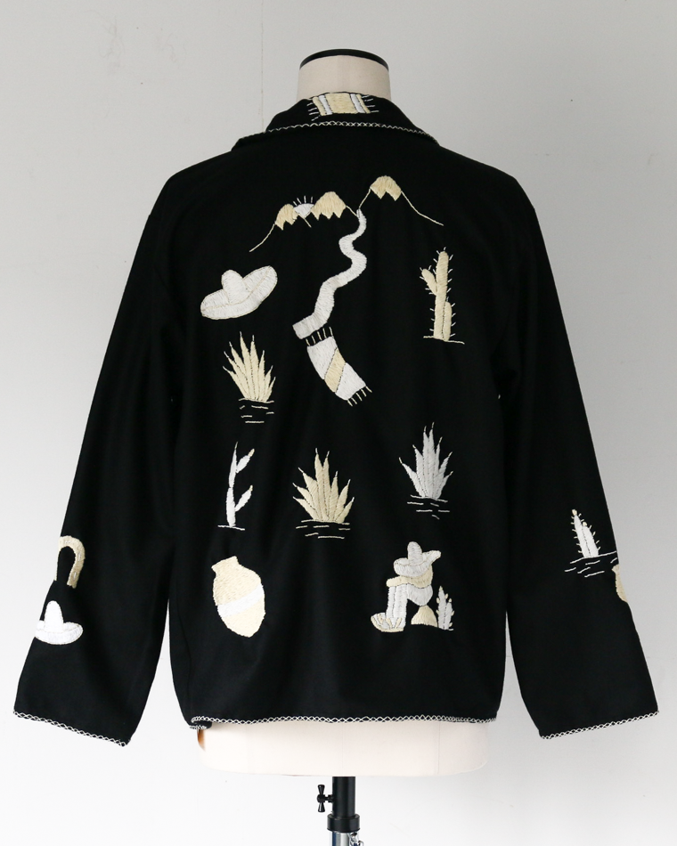メキシコらしさのあるサボテン、帽子、ホースシュー、風景などを贅沢に手刺繍した非常に手間の掛かった作品です。