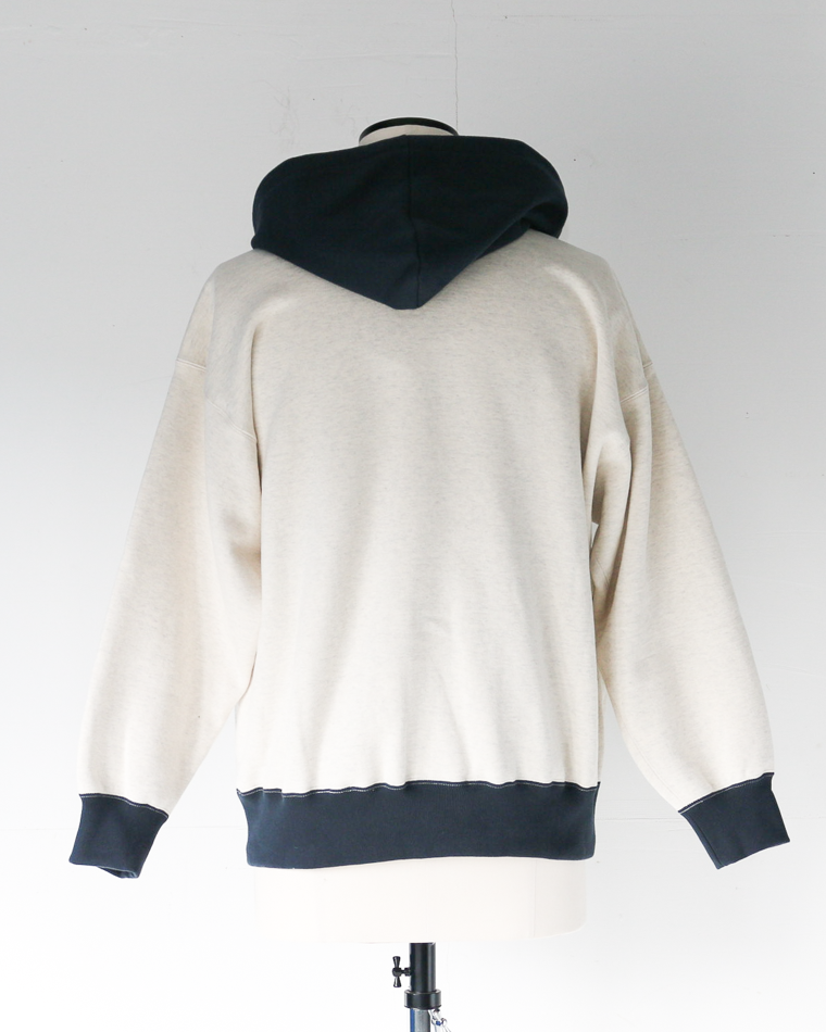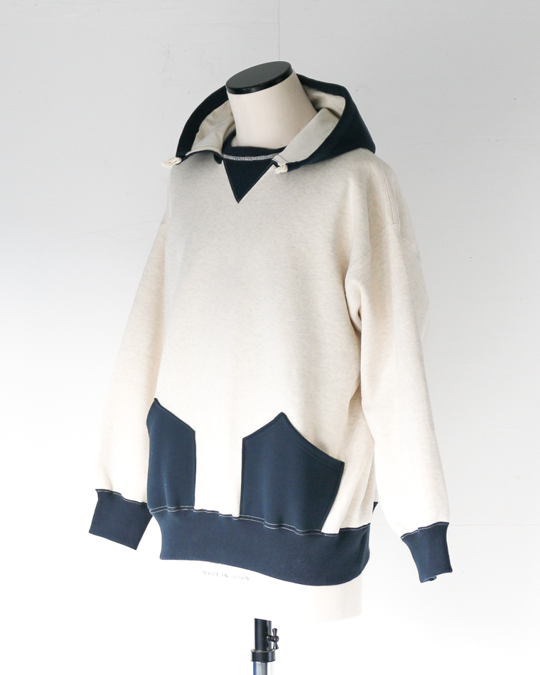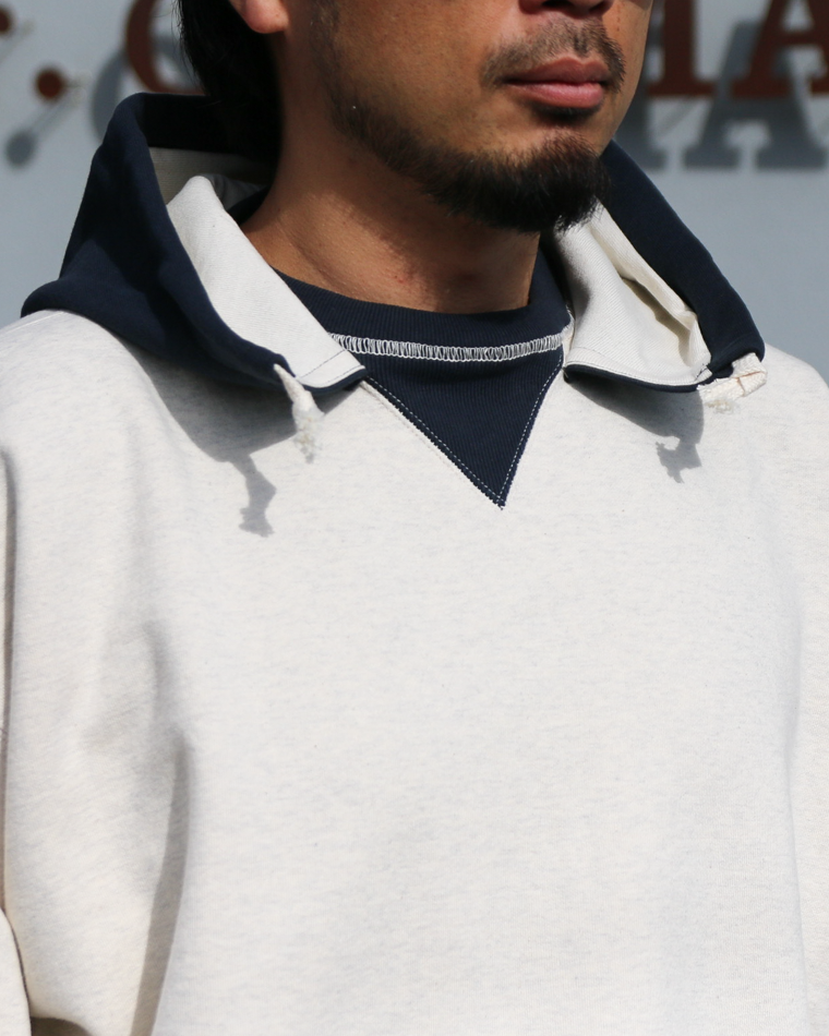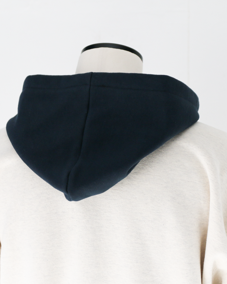フードの裏は切り替えにしてボディの裏毛よりは薄いT シャツ生地。