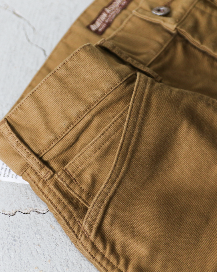 背後の腰にはジーンズのようなヨークが見られず、ポケットはフロントに2つとバックに2つ、ウォッチポケット1つの計5つポケットの仕様で、