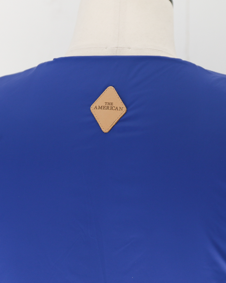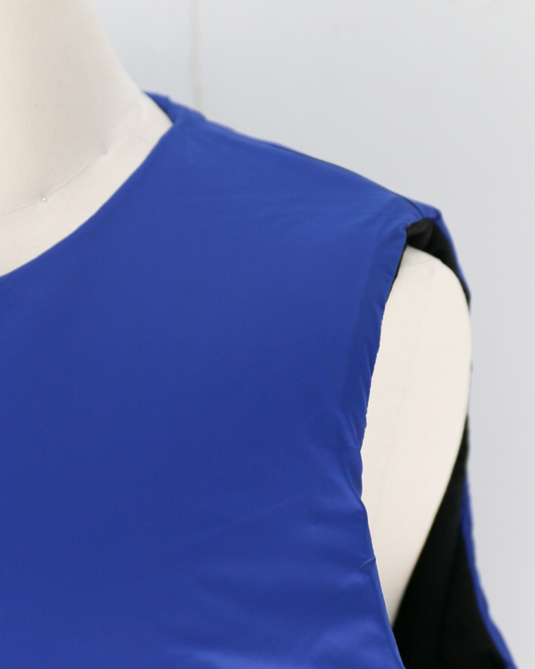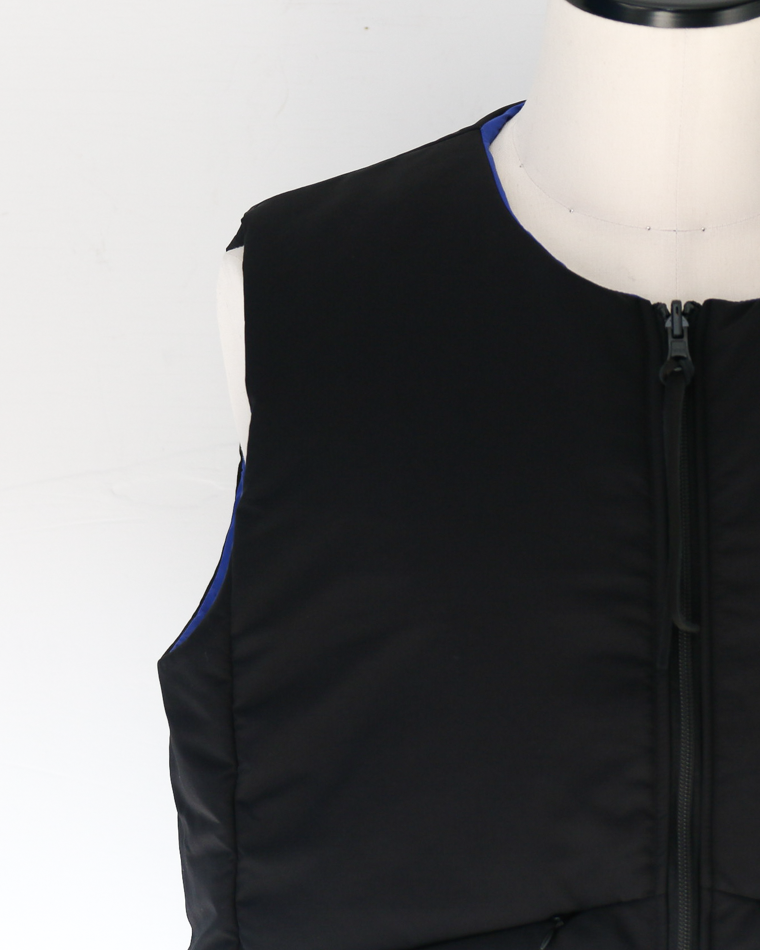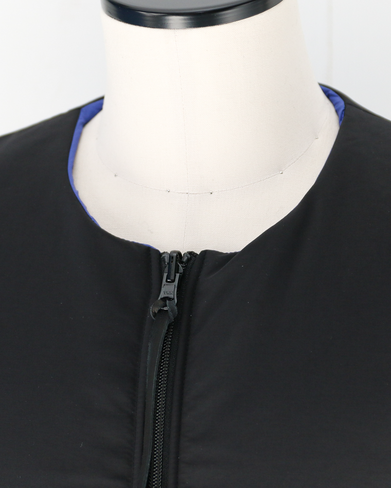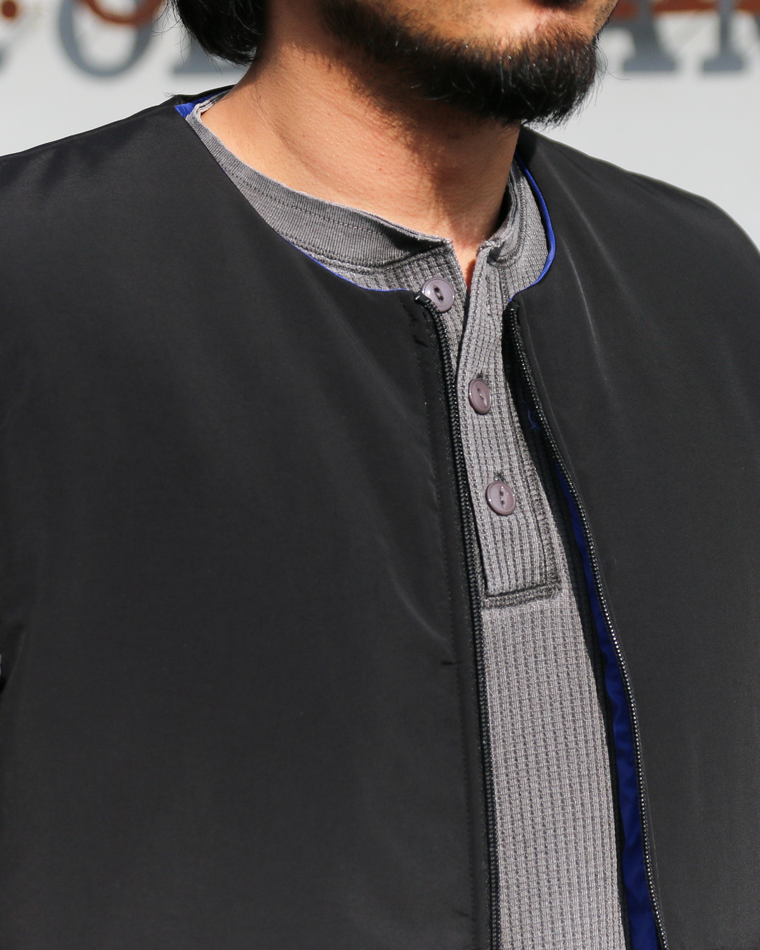 カラーレスの襟元はインナーベストとして着用する際にすっきりと収まり重宝する。