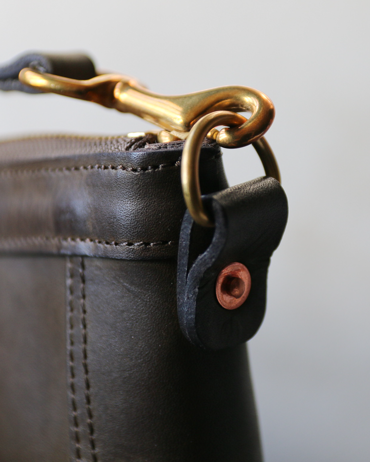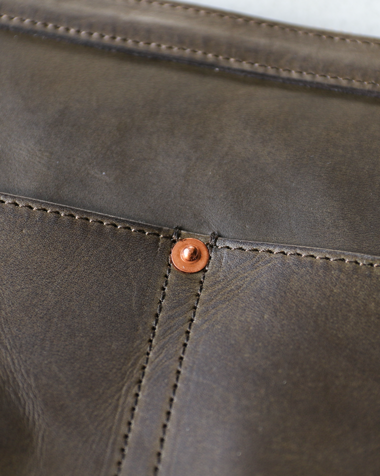 ミモザやチェスナットから抽出されたタンニンで鞣された、姫路産フルベジタブルタンニンレザーを" 丘染め" と呼ばれる